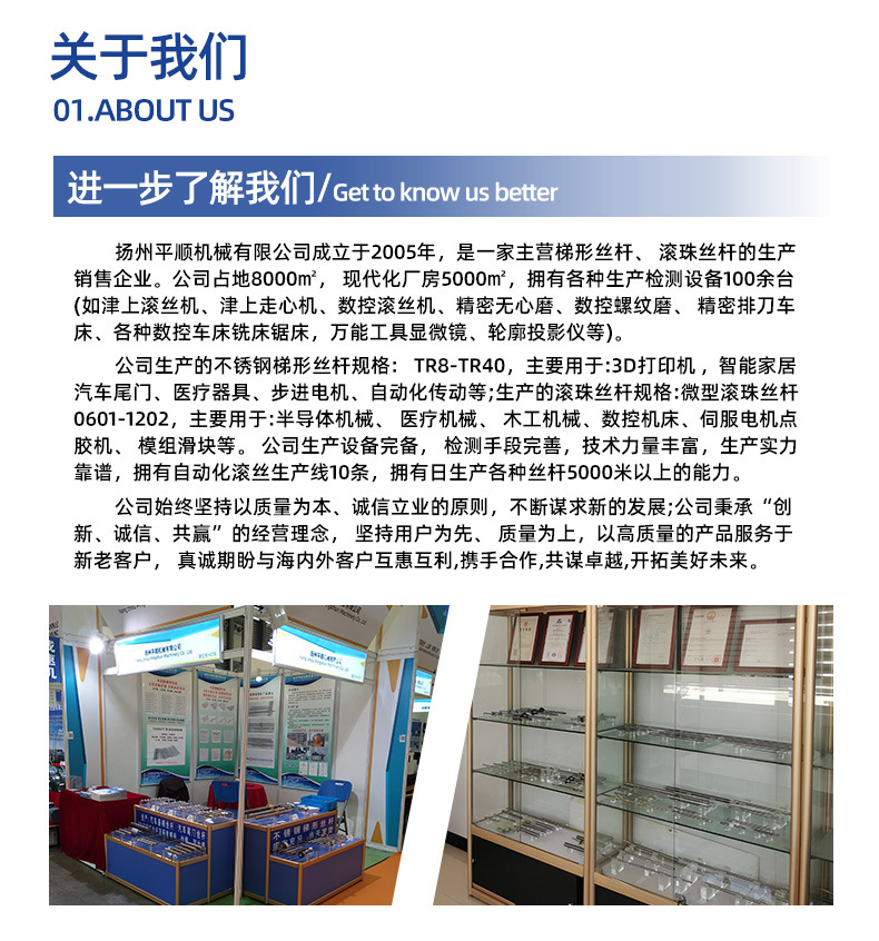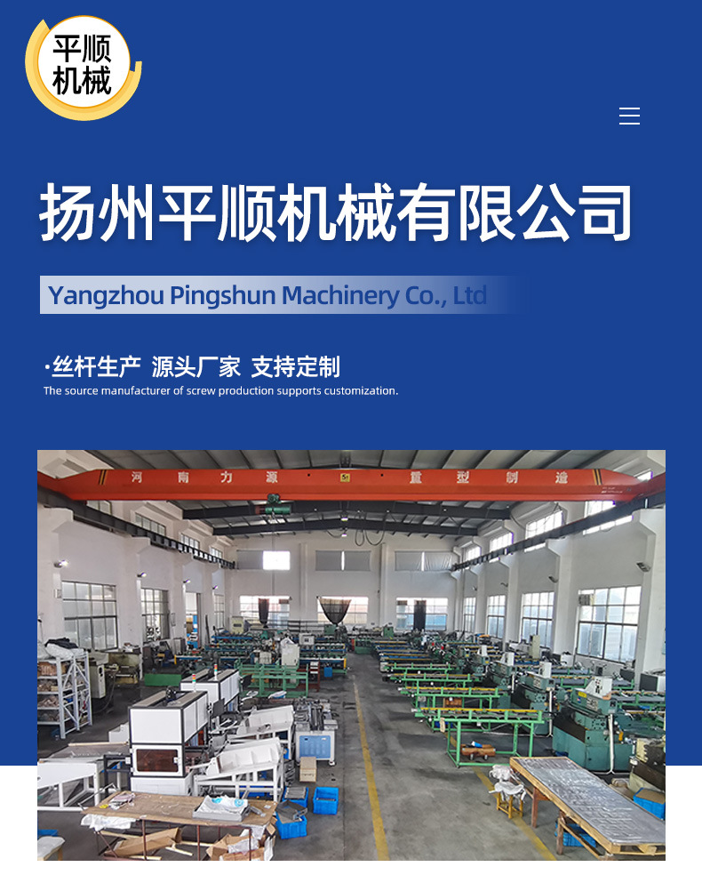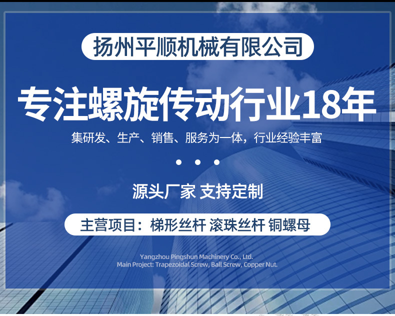 扬州平顺机械有限公司是一家专业从事梯形丝杆、滚珠丝杆、配套螺母及滚丝模具研发、生产、销售为一体的综合性企业。