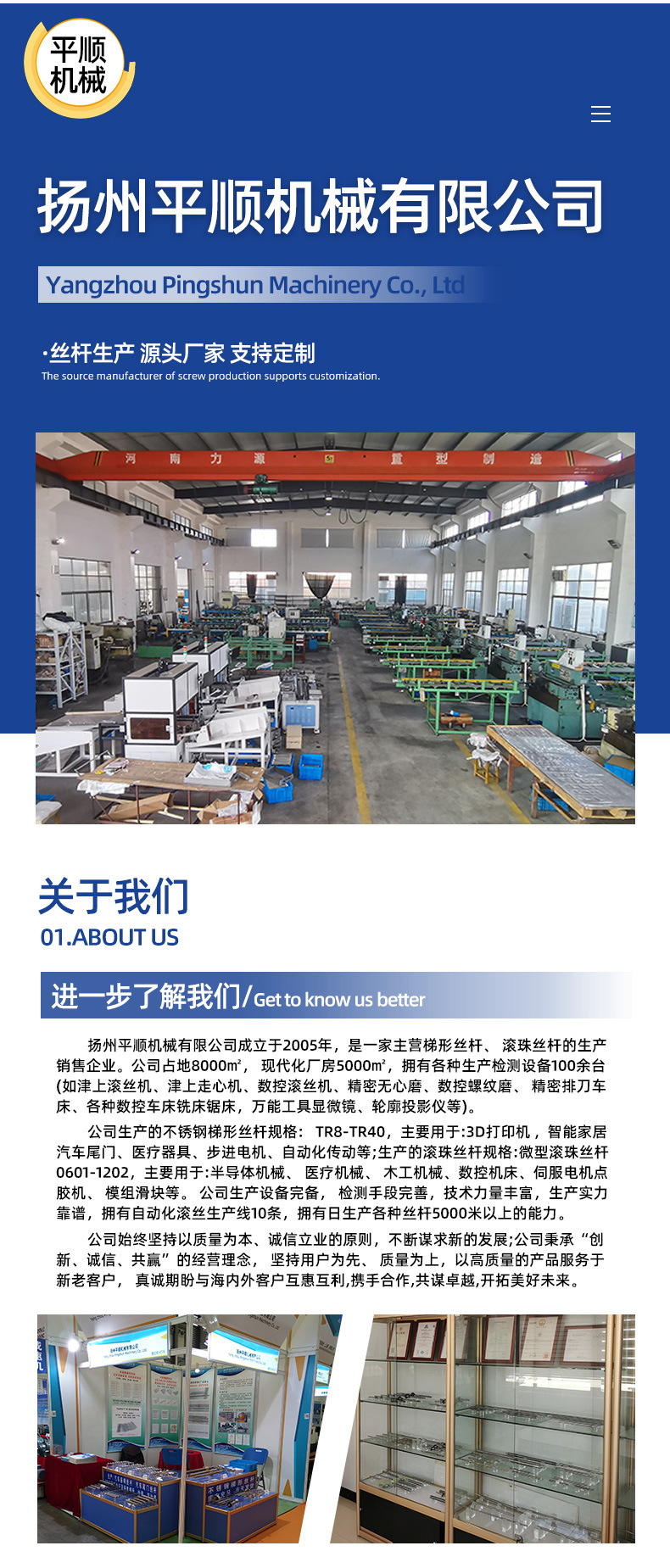 扬州平顺机械有限公司是一家专业从事梯形丝杆、滚珠丝杆、配套螺母及滚丝模具研发、生产、销售为一体的综合性企业。